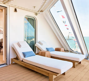 ゆったりとしたモダンスタイリッシュな客室は、すべてプライベートバルコニー付き。外に出て潮風に触れ、海を感じることができます。