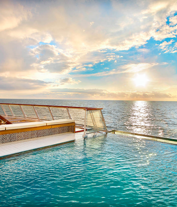 船首へと視界がひらける2層構造の”エクスプローラー・ラウンジ”は、航路の先へ伸びていく大海原をパノラマビューで一望いただけます。心ときめく出入港シーンや、島へ静かに迫る瞬間。その高揚を、いちばん近くで感じられる特別な場所です。
